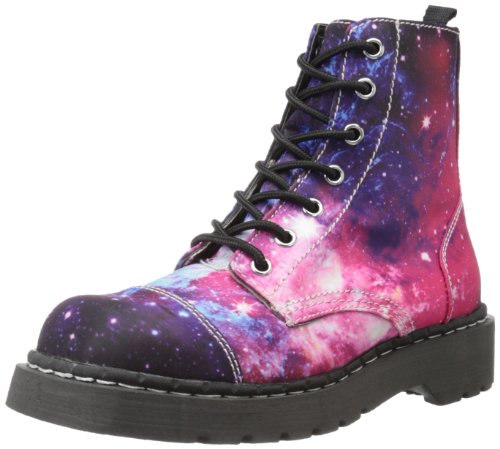 TUK Anarchic 7 Eye Ladies Boots In Intergalactic Galaxy Print. Made From Printed Textile. Synthetic Leather Lining. Rubber Sole.